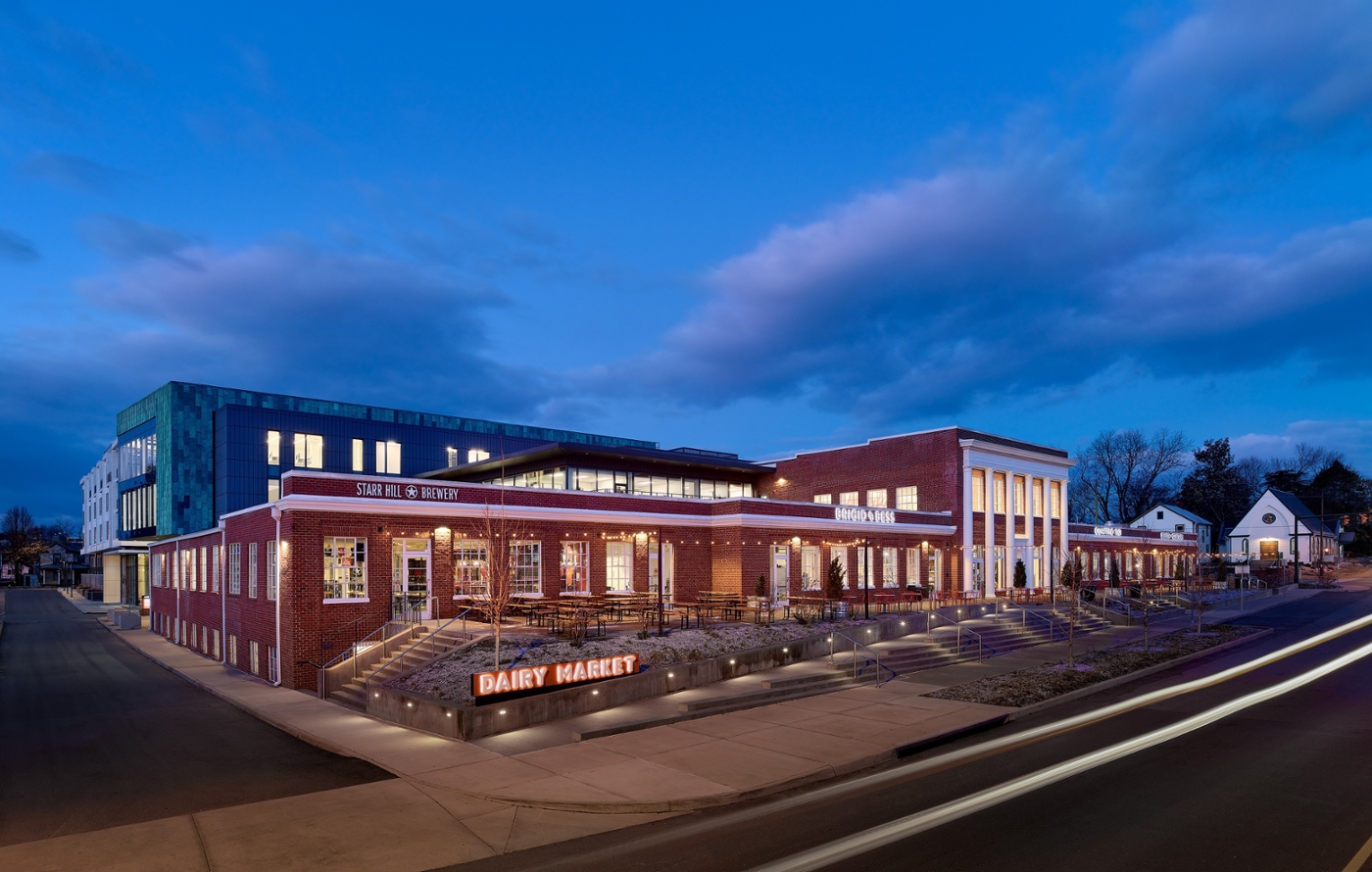 Led by Cunningham | Quill Architects, the comprehensive adaptive reuse of the historic Monticello Dairy established the revival of this lost community landmark in Charlottesville, Virginia. Working with contractor Hourigan, the architects sought to create a community-driven venue to draw people back into the building.