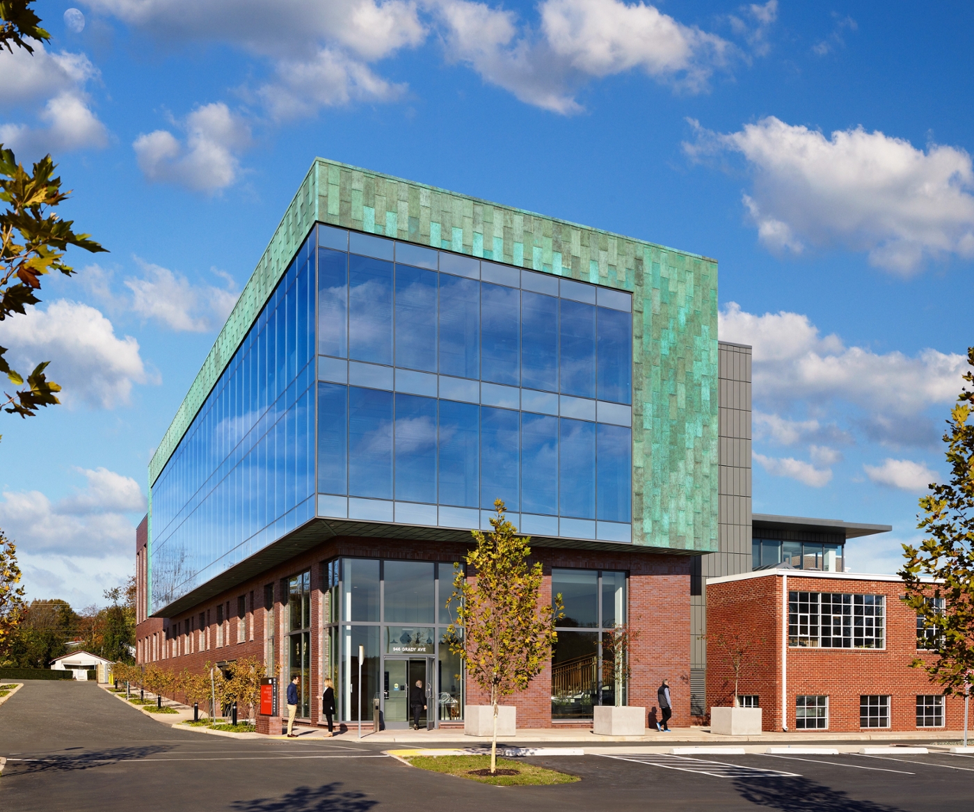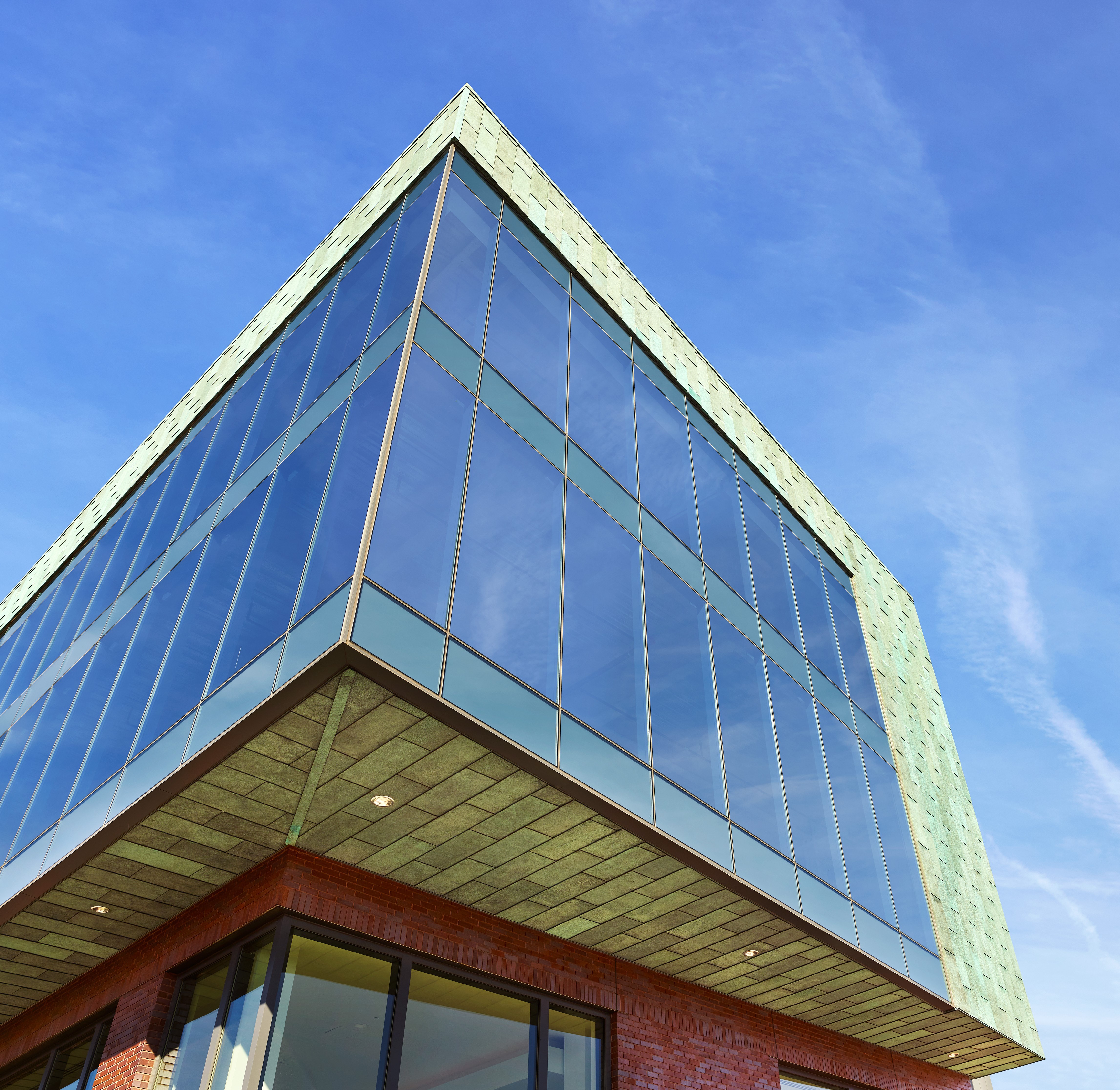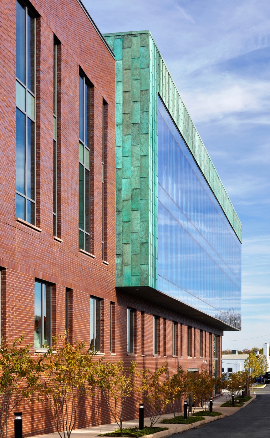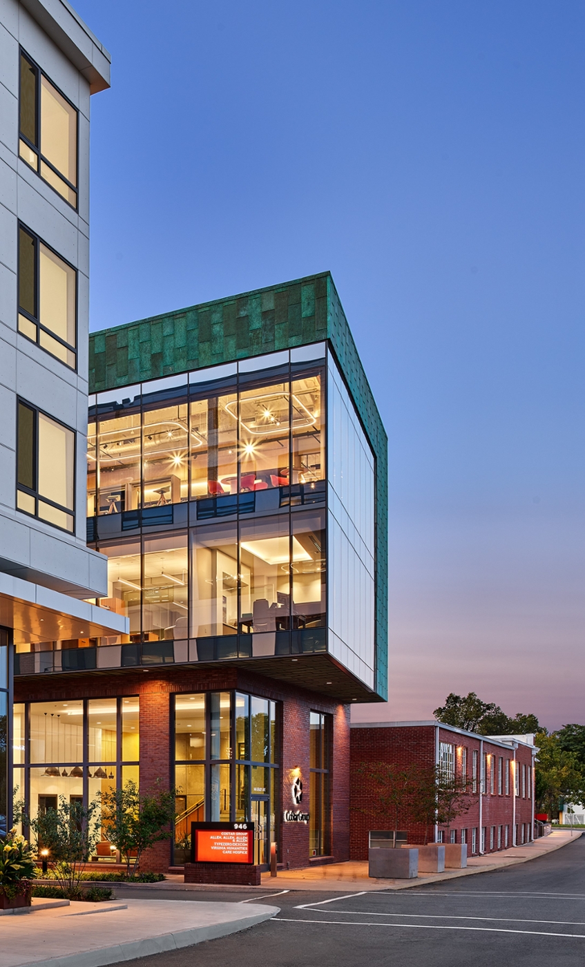 To celebrate the project’s industrial heritage but also create a new identity, the team focused on complementary materials that expressed a stylistic shift from the historically influence Dairy Market. Pre-patinated, verdigris copper flat-lock panels comprise one of the most distinctive elements of this transformation. The cladding complements the Dairy Market’s “Virginia” red brick and emphasizes the floating volume of the office building. A seamless transition between the copper panels and the glass curtain wall accentuates the lightness of the office addition, providing a literal window to the present-day office activities.